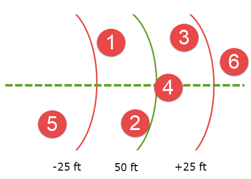 Here, the dotted green line represents our search direction. The solid, curved green line represents a lag size (search distance) of 50 feet, and the red lines represent an area (lag tolerance) marking 25 feet on either side of our search distance. Samples 1, 2, 3, and 4 would be used in the calculation because they are located within the tolerance zone. However, samples 5 and 6 would be ignored.