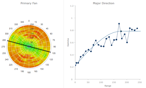 It is possible to select a separate colour for each variogram by selecting the data set from the drop-down list in Data Set, then selecting the colours and marker style. Â As you rotate the through the various angles of the Primary fan on the left using the angle selector, the variogram chart on the right will reflect the changes in colour.