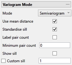 Standardise sill - Select this check box if you want to standardise the variogram sill by dividing the results by the sample variance. This is useful when calculating a semivariogram because instead of reaching the sill at the sample variance it will reach it at 1.