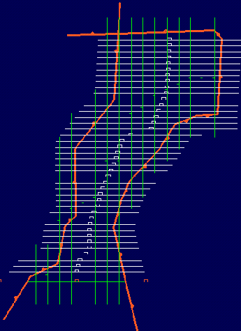 Using another Grid Calc macro, create limit polygons for each bench. Store them in a design database for use in Rsvute. Each bench limit line is generated from the intersection of the bench toe grid and topography (Diagram 2).