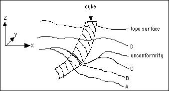 Surfaces A, B and C are given priorities of 1, 2 and 3 respectively and projected against the YZ plane. The unconformity and D are given priorities 4 and 5 and projected against the XY plane. The dyke is modelled as a 3D solid and given a priority of 6. Finally, the topo surface is given a priority of 7 and projected against the XY plane.
