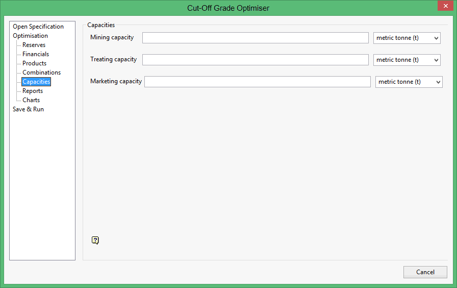 Use the Capacities section to set up the capacities for the mining, plant and recovery processes.