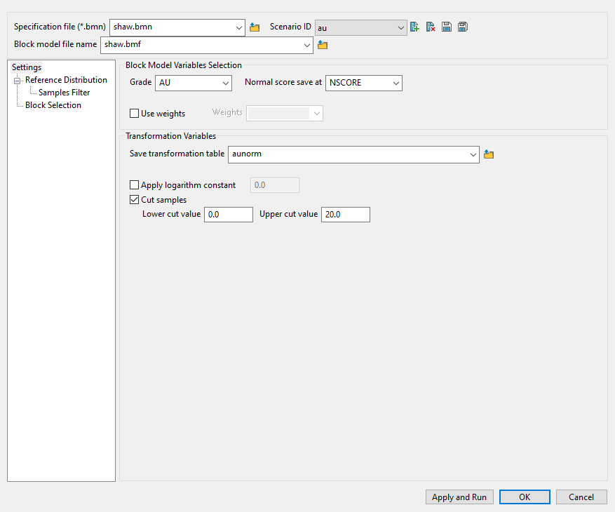 Select Cut samples if you want to apply cut-offs to the values used in the transformation. You will need to specify a lower grade cut value (grades lower than this value are set to this value) as well as an upper grade cut value (grades above this value are set to this value).