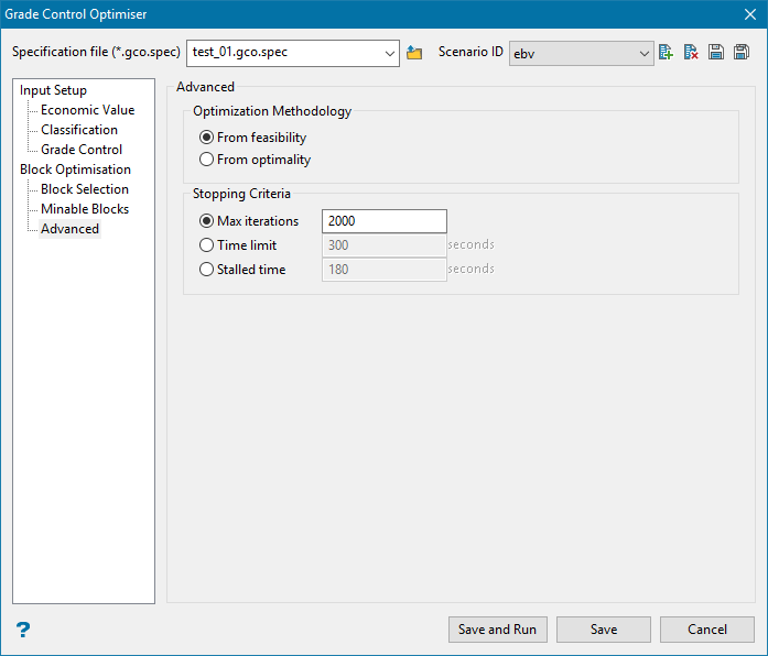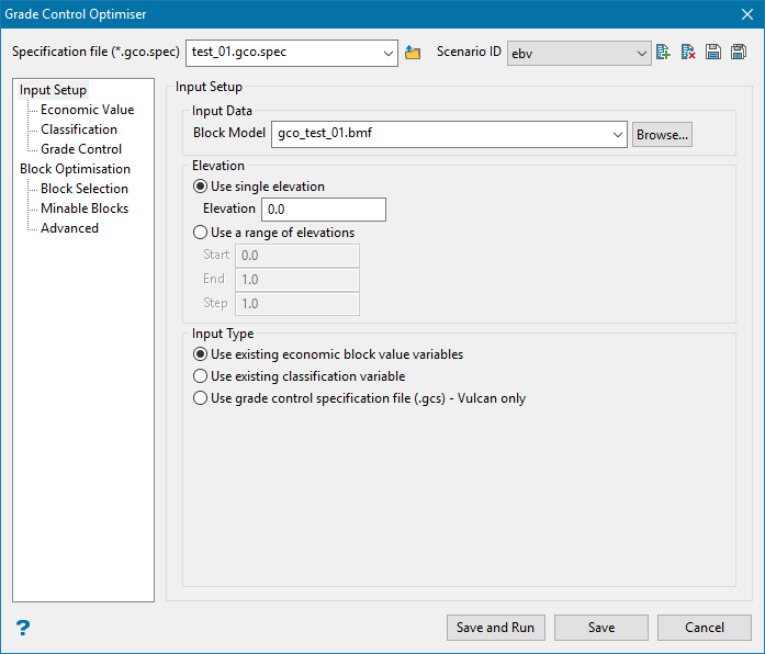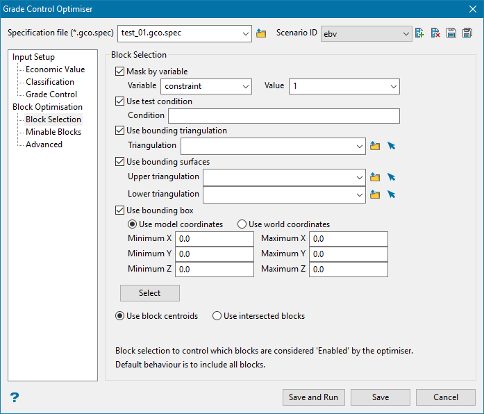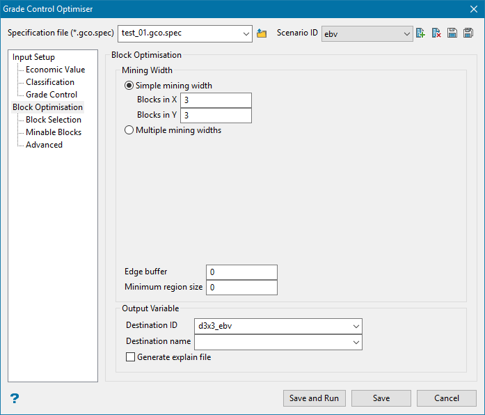 On the Block menu, click on Grade Control Optimiser to display the following interface.