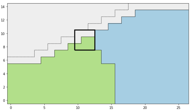 This is avoided by allowing an edge buffer even of just 1 block, which safely avoids this problem and allows this solution where the two blocks satisfy the mining width with the marked mining width element, that sits outside the allowed area.