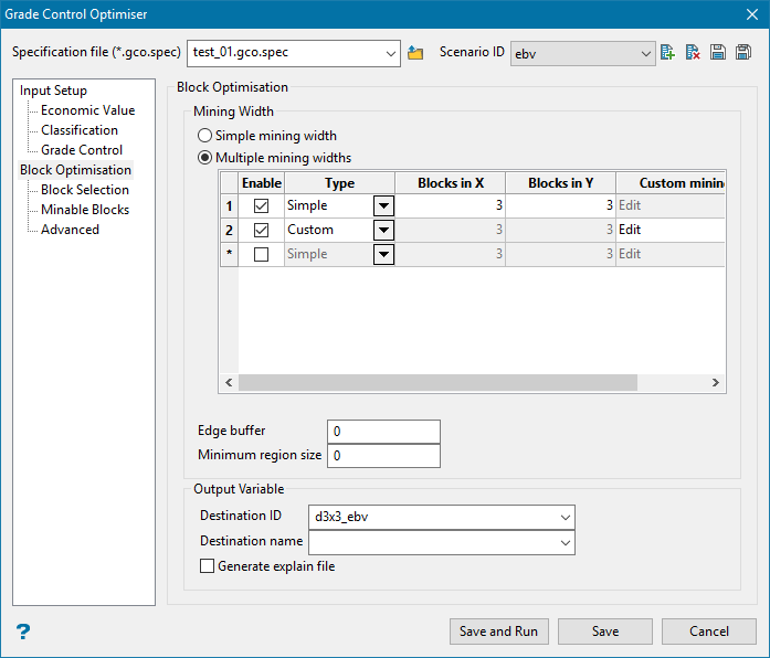 The mining width constraint is defined to the optimiser as a small collection of blocks, like a small template. The simplest option is to specify the mining width template as a rectangle. But it may also be preferable to provide a custom mining width, or even multiple possibilities.