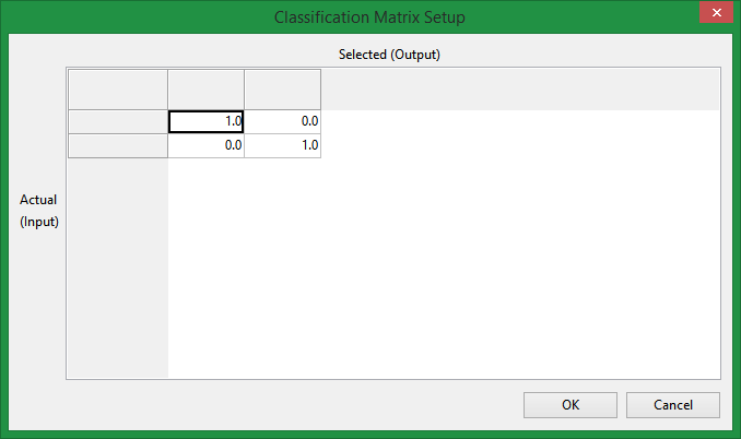 Read this matrix by column and then row. If a block is input as a specific destination in the Classification Variable then it will have a column, the rows in that column indicate the value for each possible output destination. That is, if a block is input as dest1, and the optimiser leaves it as dest1 it will receive one point. The optimiser would like to maximize points, so by changing the values you can change the relative benefit of a certain reclassification.