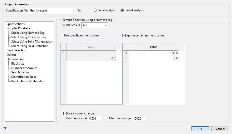 Enable Sample Selection Using a Numeric Tag to apply numeric restrictions to any field you select from the Numeric Field drop-down list. Only numeric fields will be shown in the drop-down list.