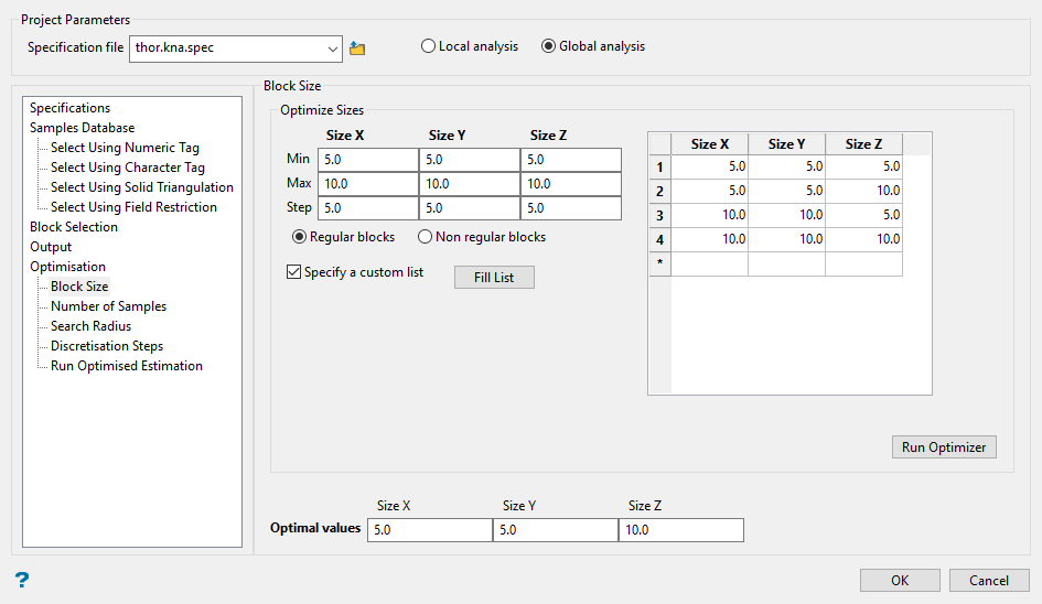 Enter the Optimal values for X, Y, and Z sizes after running the optimisation has completed and you have reviewed the results. These values will be shown on the Optimisation pane and used when using the option Run Optimised Estimation.