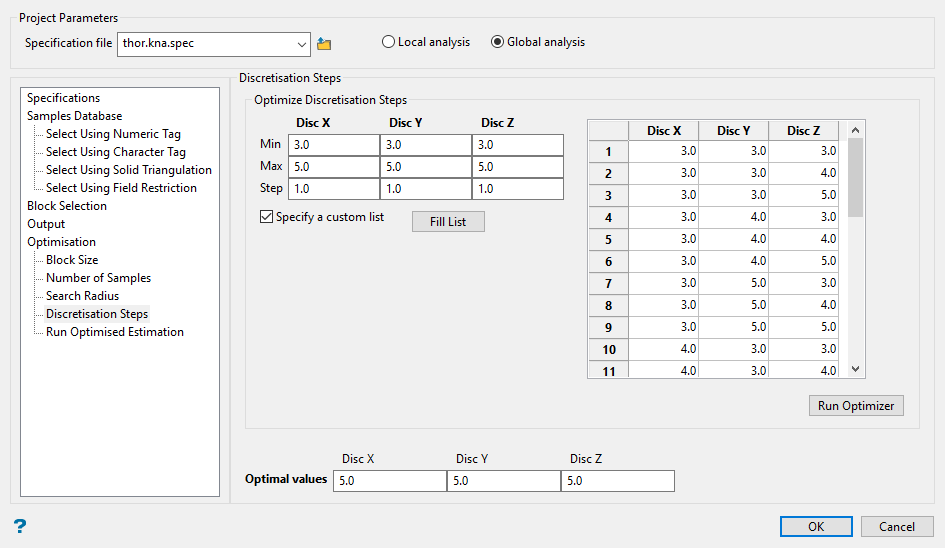 Enable Specify a custom list to activate grid where the you can add items manually. By clicking Fill List, all possible combinations for the discretisation steps will automatically populate the grid.