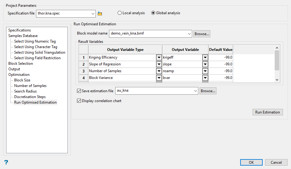 Select this option to run an initial estimation based on the optimal settings you have selected. This will create a new block model. The settings used can be viewed on the Optimisation pane. The block estimation file can then be opened and edited in the Estimation Editor to run a more complete estimation.