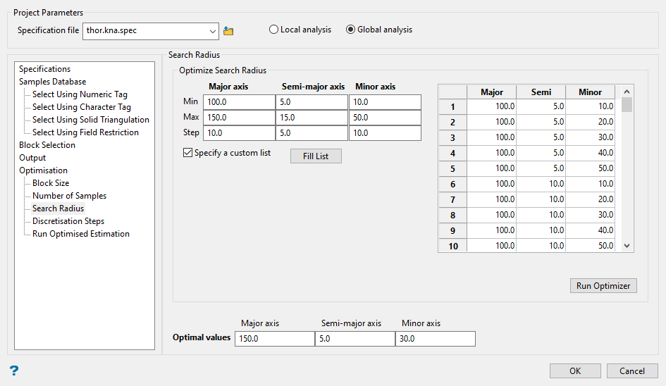 Enable Specify a custom list to activate grid where the you can add items manually. By clicking Fill List, all possible search radii combinations for the Major, Semi-major, and Minor axes will automatically populate the grid.