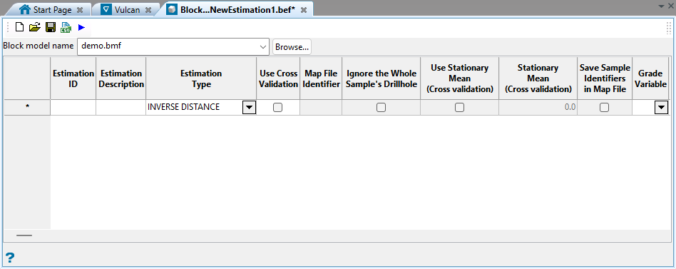 We recommend that you create your first estimation file by using the appropriate option in the Block > Grade Estimation submenu. Once created, you can use the Block Model Utility to update the estimation parameters.