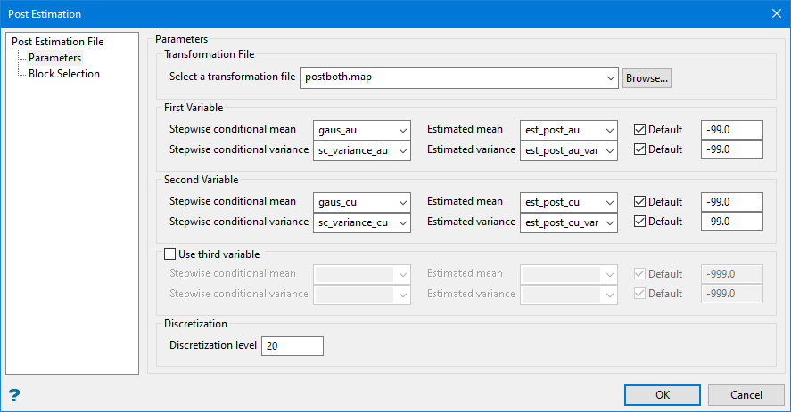 The second and third variables are transformed using the conditional Gaussian transformation as defined in the Gaussian transformation table. The parametric distribution is sampled a number of times so a number of grade values can be obtained in order to get a grade distribution. From this distribution the expected (mean) value and variance can be stored into a nominated block model variable.