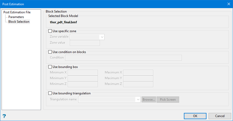 Use bounding triangulation - Select this check box if you want to limit the estimation to those blocks that lie within a specific solid triangulation. The list contains all triangulations in the current working directory. Click Browse to select a file from another location.
