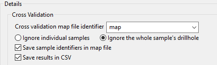 Select the Cross validation fields you want to use. These fields are from the database that you selected above. From the drop-down list labelled Drillhole field for cross validation, select the field that holds the drillhole identification information. Then from the drop-down list labelled Name, select the data field to be examined.
