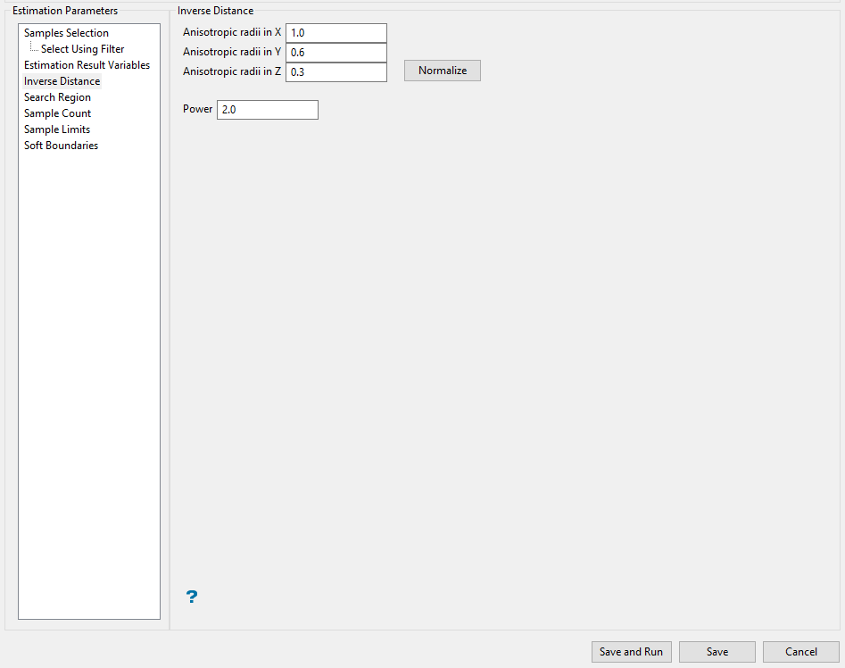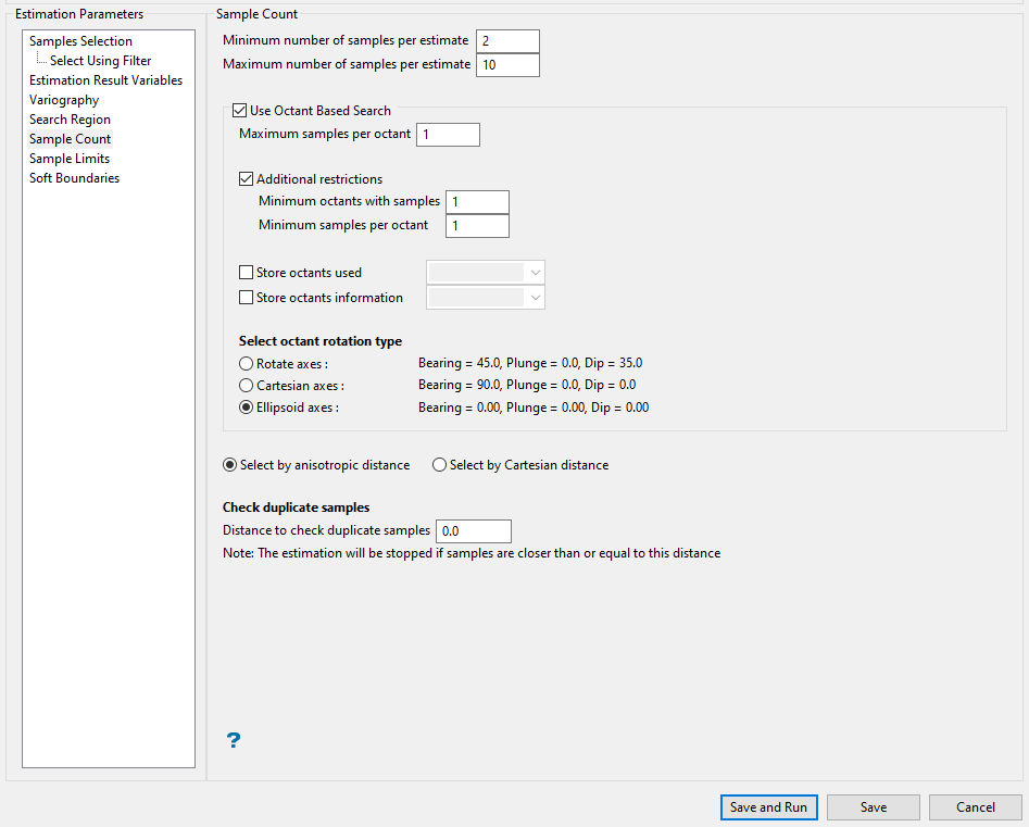 Example: Â The estimation program may find 30 samples near a block centre. If you had specified a maximum of 10 samples, then only the 10 samples closest to the block centre are used. The distance to the block centre is calculated by an anisotropic distance based on the search radii.