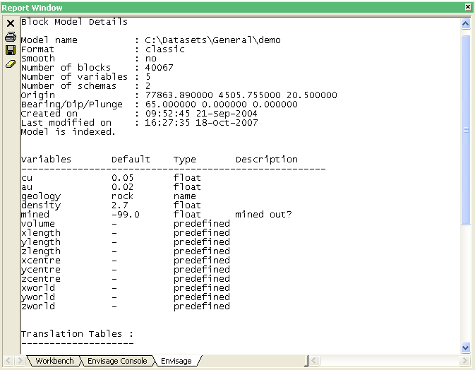 The description is then assigned or, if applicable, updated. The Header option can be used to view the block model information (via the Report Window).