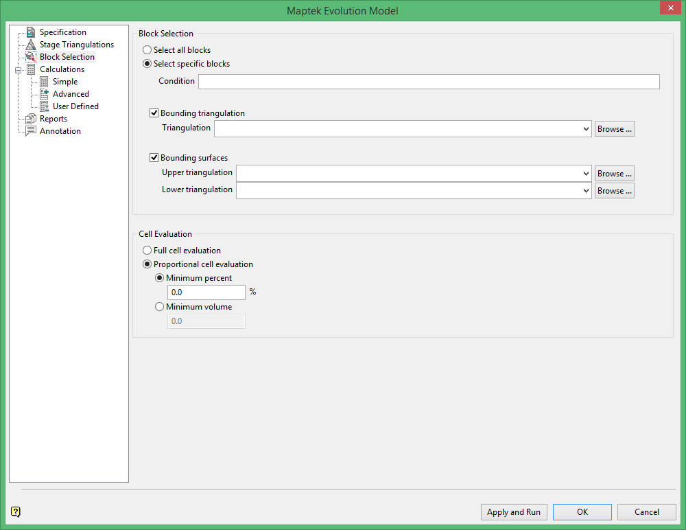 Select this check box to restrict the blocks by a triangulation. This is useful when, for example, you want to evaluate reserves within a particular solid triangulation such as a stope.