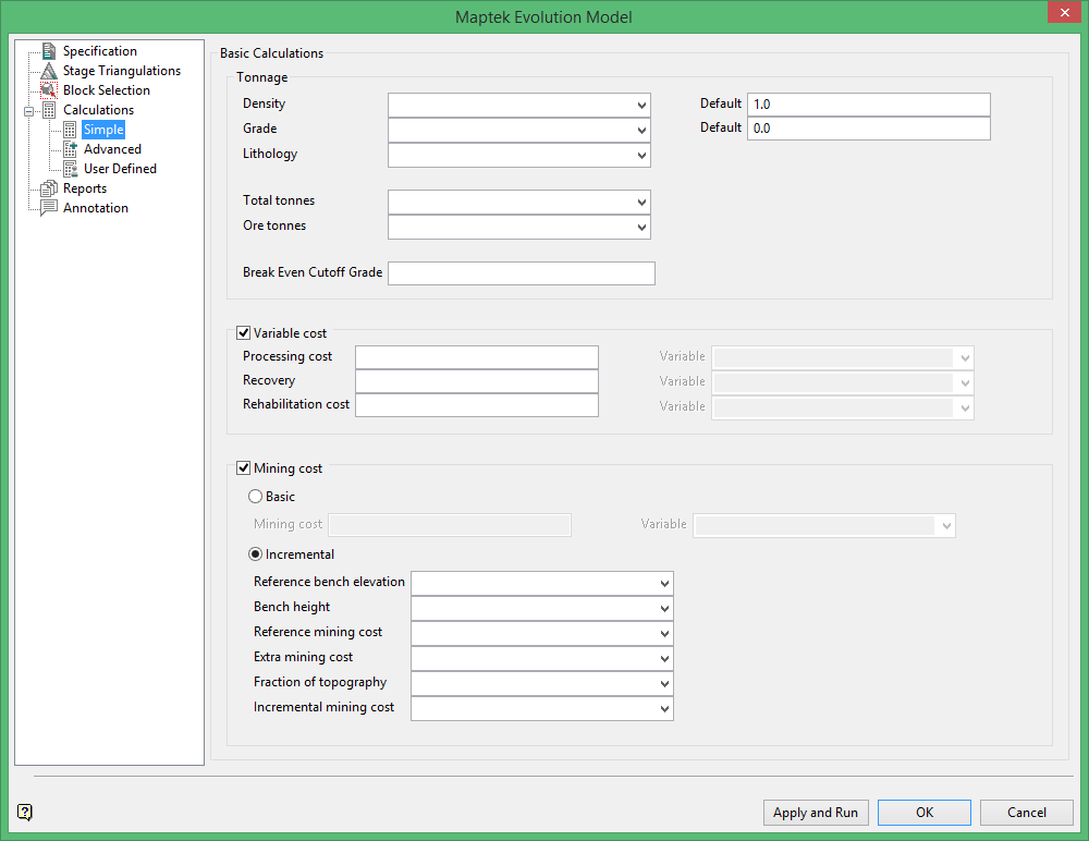 From the block model, select the variables for Density, Grade, Lithology, Total tonnes and Ore tonnes. Â Then assign default values for Density, Grade and the Break Even Cutoff Grade.