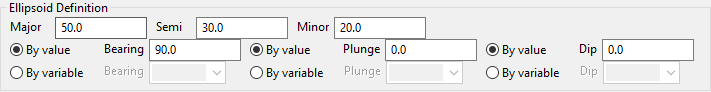 Use Ellipsoid Definition to set up parameters for using By Ellipsoid by specifying the bearing, plunge, and dip of the search ellipsoid. You can enter the values in directly or use a variable from the block model.