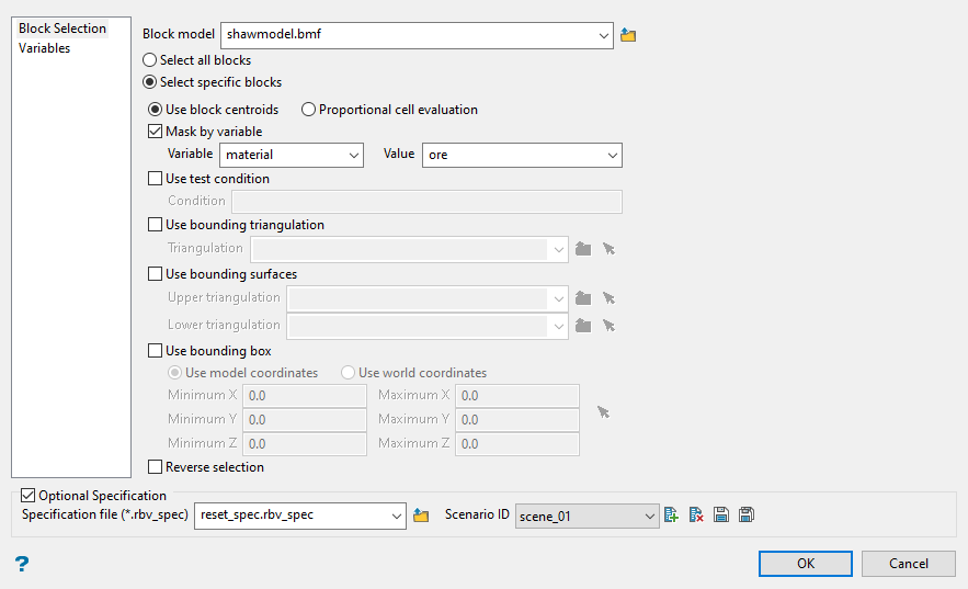 If you select this option, you must enter the minimum and maximum coordinates for X, Y, and Z in the block model coordinates (X. Y, Z CENTRE). If the block model origin is set at 0,0,0, then real world coordinates should be entered in the X, Y, and Z minimum and maximum coordinates. If the block model origin is set at real world coordinates, then enter coordinates for the bounding box that are offset a certain distance from the origin. The distance of offset will be determined by the dimensions of your bounding box. It will be the distance to the minimum and the distance to the maximum X, Y and Z from the origin of the block model.