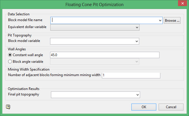On the Block menu, point to Pit Optimiser, and then click Floating Cone to display the Floating Cone Pit Optimisation panel.