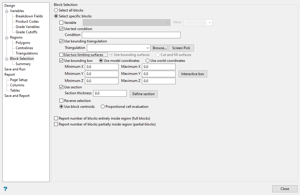 1. By default, Select all blocks will be automatically selected for the reserve calculations. If you wish to leave the default setting as it is, then you do not need to do anything with this panel. However, if you want to limit which blocks are used, enable the option to Select specific blocks. This will make all the other options available.