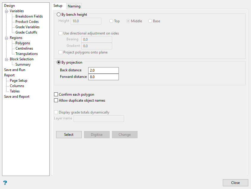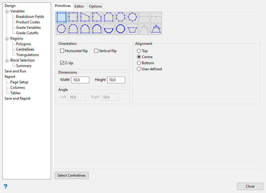 The Centrelines method will output the region length whereas the Polygon and Triangulation methods will not. This can be useful in an underground application where you measure the advance rate in distance per day. There are three tabs on this panel, which are the standard primitives panels. The Primitives tab lets you select the shape, the Editor tab lets you create or load your own primitive shape, and the Options tab controls triangulation naming.