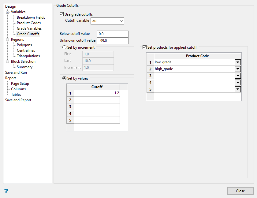 Use the Product Codes panel to create temporary variables based on conditions created for reporting purposes. These temporary variables are not added to the block model but only exist in the Advanced Reserves report.