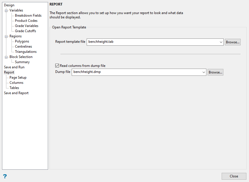 1. Begin by selecting the Report template file that you want to open. The name of the currently open specifications file will be used by default, for example if the reserves specification file is named myreserves.res, then the value within this field will be myreserves.tab. The drop-down list contains all (.tab) files found within your current working directory. Click Browse to select a file from another location.
