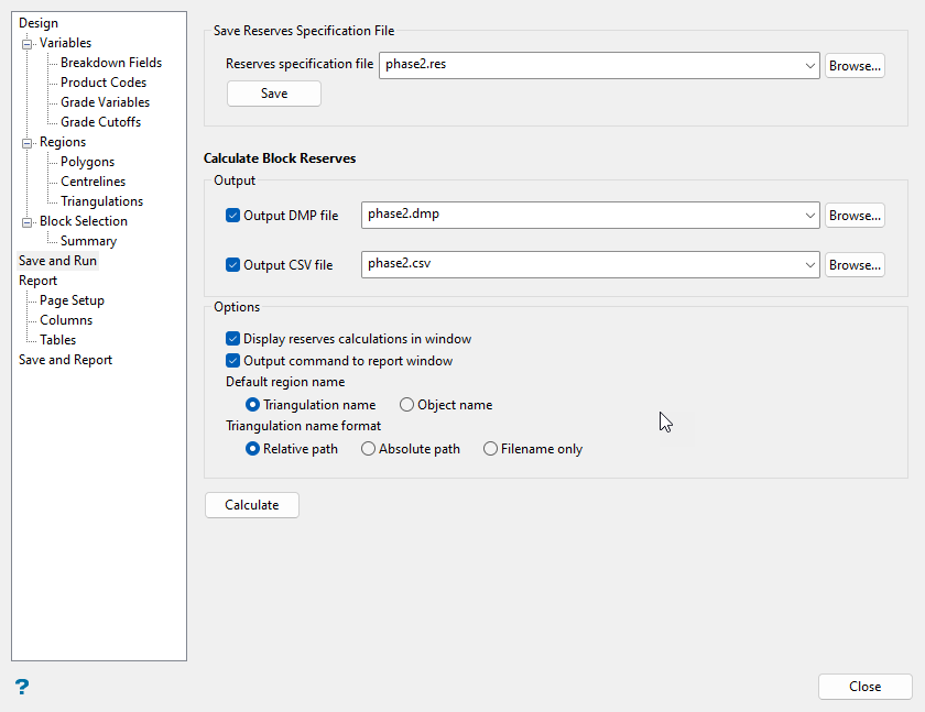 4. Finally, click Calculate to run the reserves. Depending on your output settings, you may see a report window display the calculation results as they are being done. A DMP file and/or CSV file will be generated and stored in your working directory when the calculations have completed.