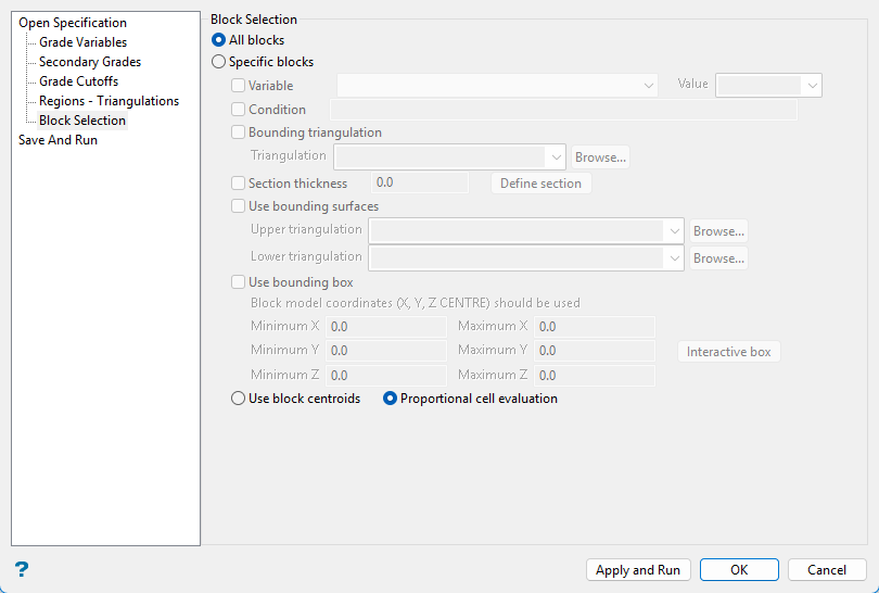 Enable Use mined out variable if you have a block model variable representing different regions in which you wish to evaluate.