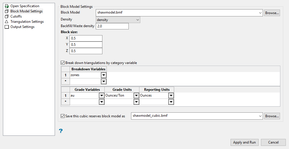 Use the Block Model Settings option to choose block model variables to use in the cubic reserving process.