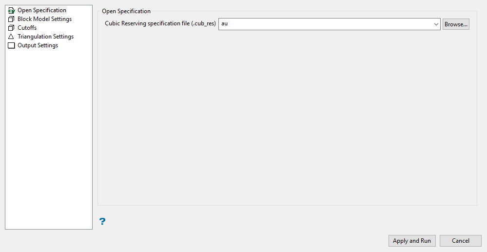 .cub_res) in Cubic Reserving specification file, of select one from the drop-down list. The drop-down list contains all of the (.cub_res) files in the current working directory. Click Browse to select a file from another location.The configuration settings stored in the nominated file will automatically populate the contents the Cubic Reserving interface when loading a previously saved specification.