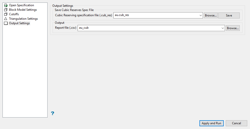 Use the Output Settings option to choose the report file that will be used to store the resulting report information. The Output Settings section can also be used to save the configuration settings in a different Cubic reserving specification file.