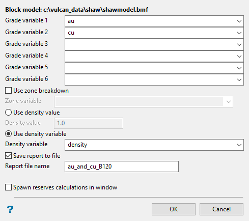 This feature is optional. If no cut-offs are applied, then the results will report all reserves found in the block model. If cut-offs are provided, then the results will include reserves only for the cutoffs listed.