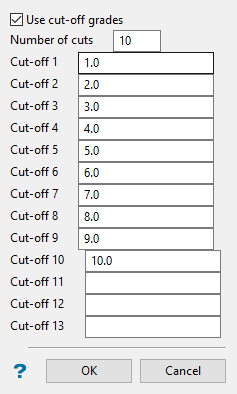 Check Use cut-off grades if you wish to set cut-off thresholds. Enter the number of cuts to use, then the cut off values (up to 13).