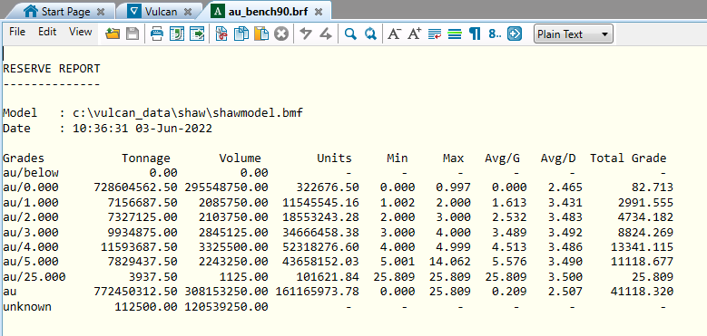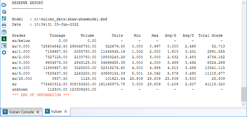 The Reserve Report will be displayed in the Vulcan Report Window.