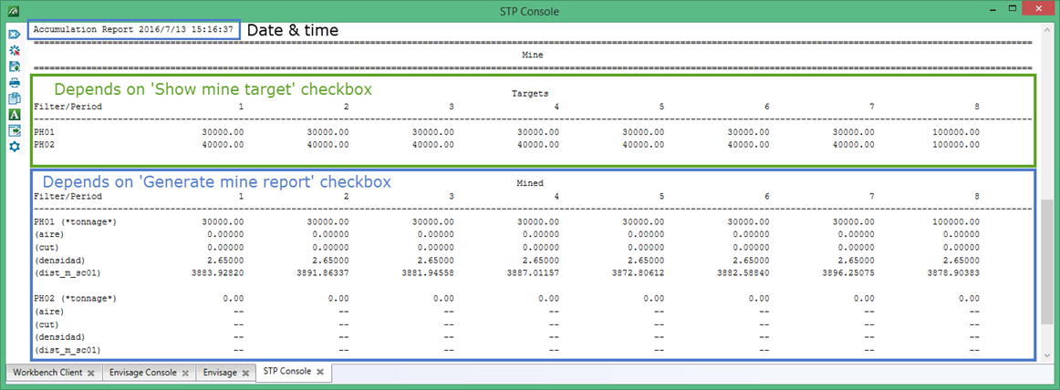 Each solid group inserted to the sequence is automatically updated in the report and will show a progress chart of each filter, with respect to the mine targets defined.