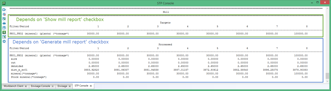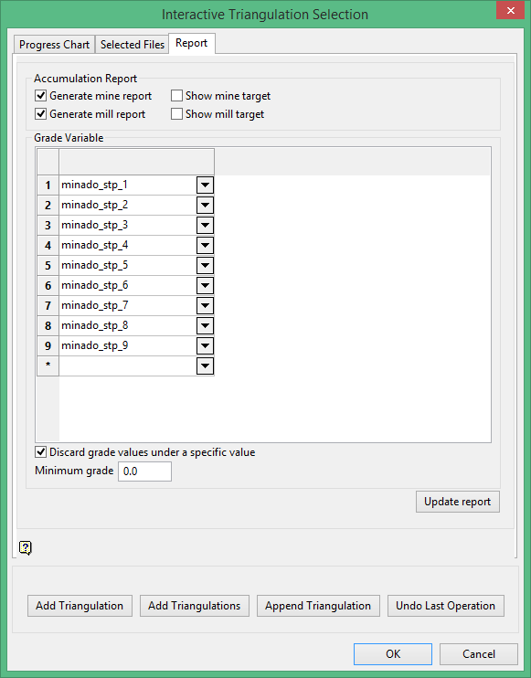 Select either of these options if you would like to generate a mine or mill report. Â If the option to generate the report has not been selected then the option to show the target will be disabled. Â The contents of the report is determined by the choices made on the Reporting panel.