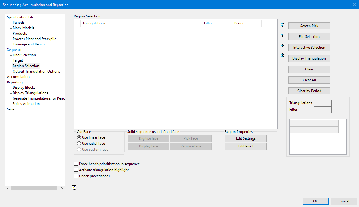 Select this option to define the mine sequence and the filter interactively from the triangulations loaded into the Vulcan window. The following panel displays.