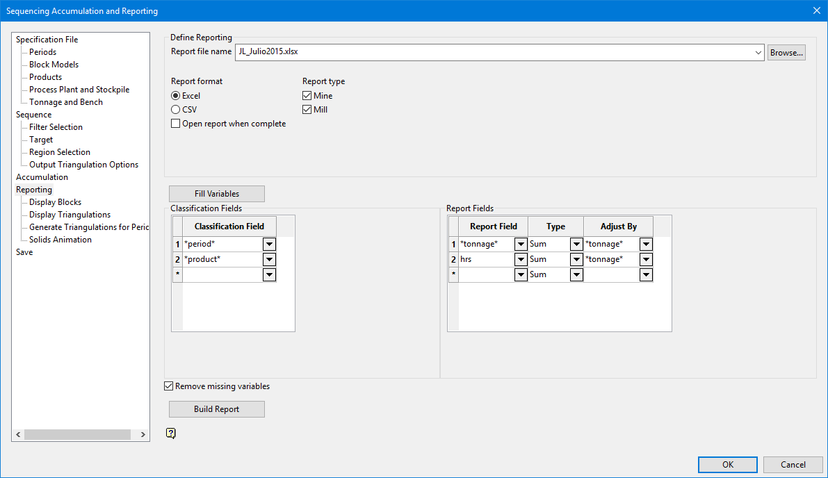 Use the Reporting option to design a mine or mill report in Excel or CSV format.