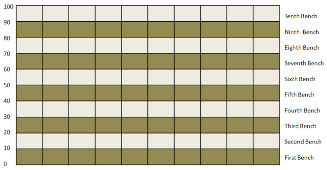 A model has an elevation value between 0 and 100, and a default height bench of 10 metres (the value taken from the primary (parent) z size in the block model). The Calculate block bench option is not used . Note all 10 benches are 10 metres in height.
