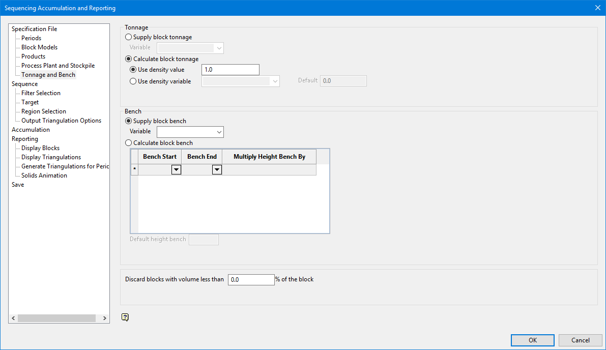 Use the Tonnage and Bench option to define the tonnage and bench parameters for each block in the selected block model.