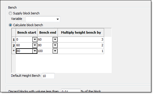 A model still has an elevation value between 0 and 100 and a height bench of 10, but between 0 and 60, the default height bench is 30 metres. Between elevation 60 and 80, the bench is 20 metres, and between 80 and 100, the bench is the default, 10 metres. The Calculate block bench option is used . These settings are shown in the panel excerpt below.