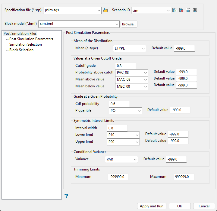 The Post Simulation option provides all the tools to process the results of a block model used in simulation.  The distribution for each block is assembled from the value of each realization stored in the block model variables. With this block distribution several outputs can be obtained, such as the mean, variance, mean above and below a given cutoff, grade for a given probability, probability for a given grade and symmetric interval limits.