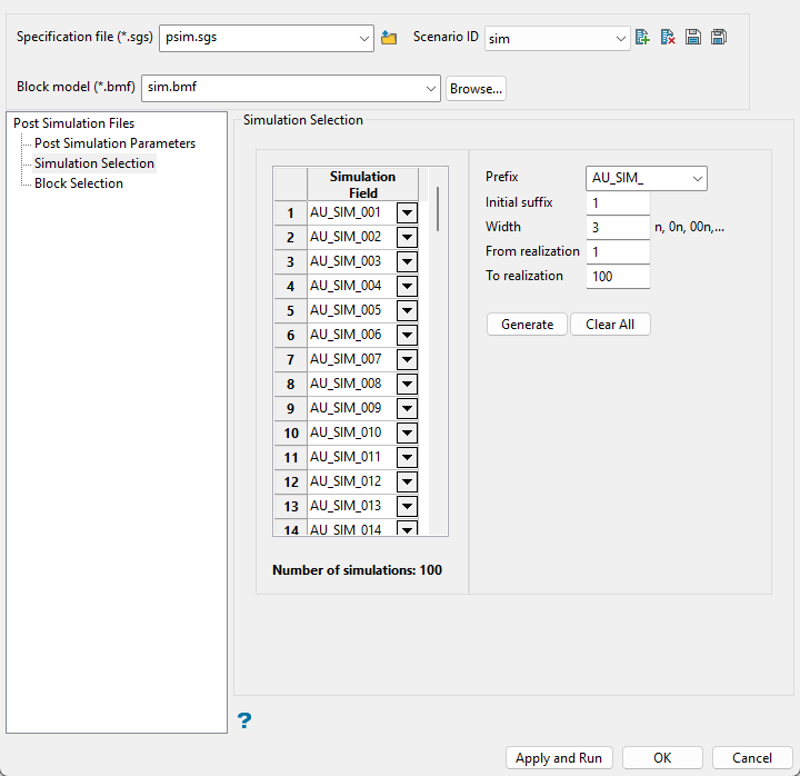 Use the Generate button to populate the Simulation Field list. This is a list of variable names that will hold the results of the individual realisation runs.