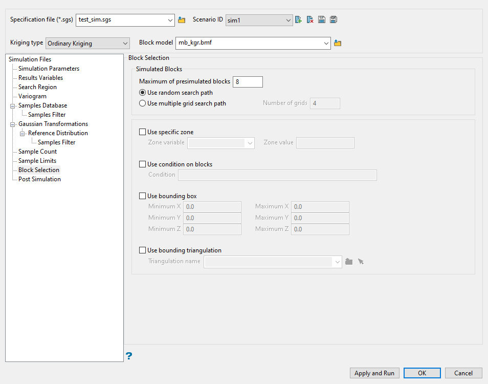 Enter the maximum number of previously simulated grid nodes that will be used together with sample information in order to simulate block model nodes in the Maximum of presimulated blocks field. If the samples were not assigned to nodes through the Simulation parameters section, then the maximum number of samples will be controlled by the parameters specified through the Search region section.