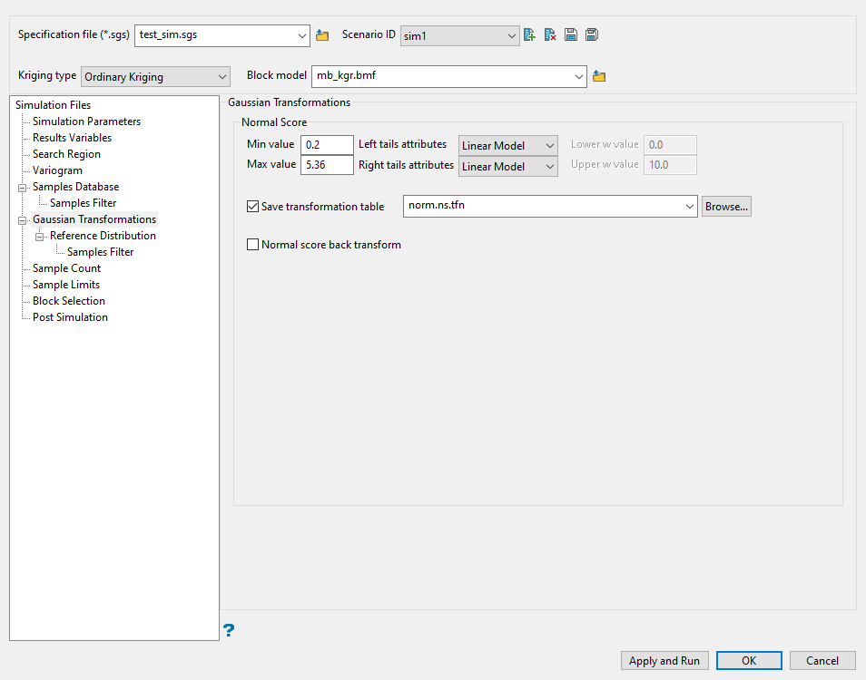 Select Normal score back transform if you want the results to be back transformed from Gaussian values to the units of the attributes that are being simulated. If this check box is not checked, then the results will remain in Gaussian units.